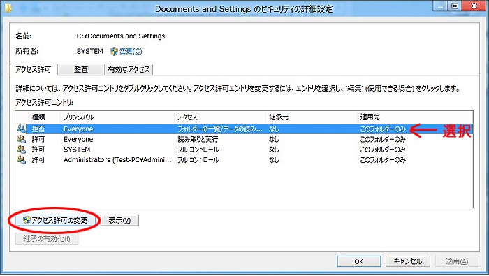 先に結論をいいますと、Windows8では、上の「拒否」のEveryoneを消せばアクセスできるようになります。