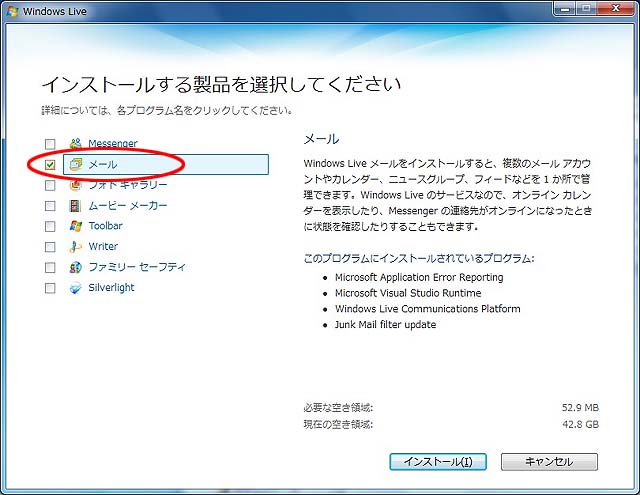 ここでは、メールのみインストールしますので、「メール」のみにチェックを入れ、