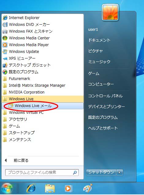「スタート」−「すべてのプログラム」−「Windows Live」にメールのショートカットがあります。