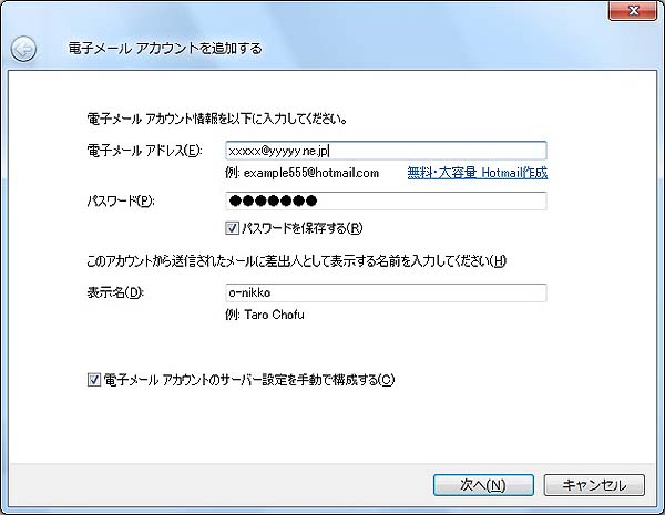 初めての起動の時だけ、このような電子メールアカウント入力のダイアログボックスが出ます。