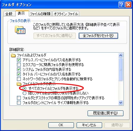 「ファイルとフォルダの表示」の選択肢のうち、「すべてのファイルとフォルダを表示する」