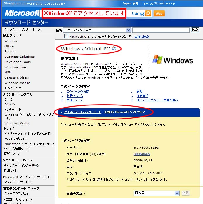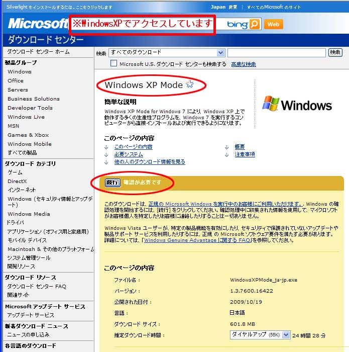 そこでWindowsXP(もちろん認証済み)でダウンロードを試みてみました。