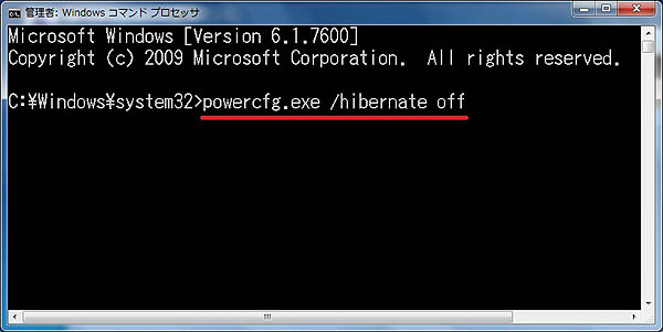 反対に、「hiberfil.sys」を作成する場合は、「powercfg.exe /hibernate on」と入力します。